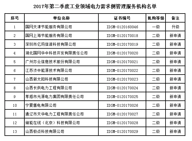 按照《工業(yè)領(lǐng)域電力需求側(cè)管理服務(wù)機構(gòu)管理辦法(試行)》(工電促[2015]2號)要求,工業(yè)領(lǐng)域電力需求側(cè)管理促進(jìn)中心組織完成了對2017年第二季度新申報機構(gòu)和申請升級機構(gòu)的資質(zhì)審核和評定工作?,F(xiàn)將符合條件的工業(yè)領(lǐng)域電力需求側(cè)管理服務(wù)機構(gòu)名單予以公布(詳見附件)。