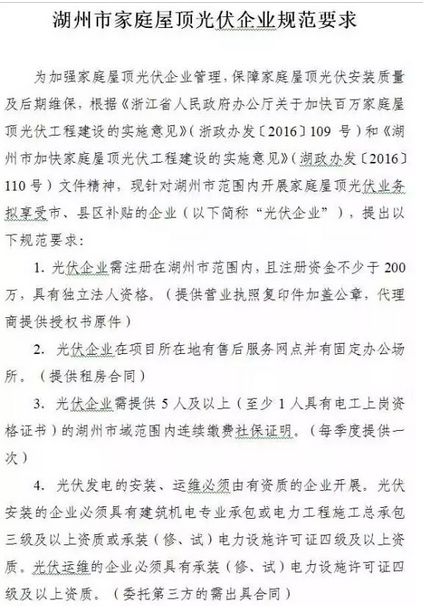 ■ 浙江湖州發(fā)改委印發(fā)家庭屋頂光伏企業(yè)規(guī)范要求