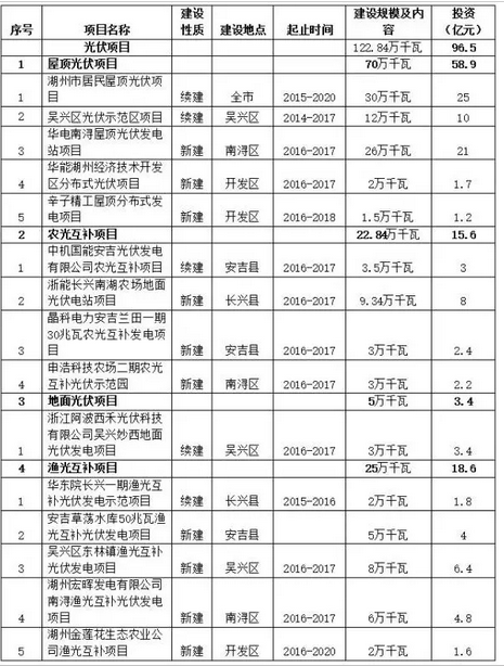 浙江省湖州市發(fā)改委印發(fā)《湖州市能源發(fā)展“十三五”規(guī)劃》,計劃到2020年光伏裝機(jī)容量達(dá)130萬千瓦。積極推進(jìn)“百萬家庭屋頂光伏計劃”,到2020年,力爭建成10萬戶家庭屋頂光伏。湖州市“十三五”重大能源項(xiàng)目(光伏)