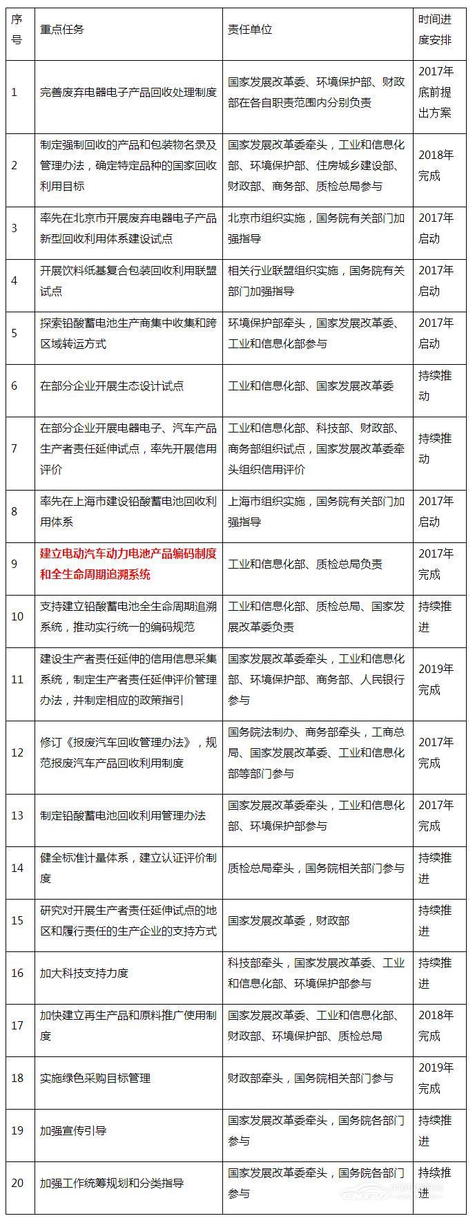 “建立電動(dòng)汽車動(dòng)力電池產(chǎn)品編碼制度和全生命周期追溯系統(tǒng)”被列為重點(diǎn)任務(wù),該項(xiàng)任務(wù)由工業(yè)和信息化部、質(zhì)檢總局負(fù)責(zé),計(jì)劃于2017年完成。