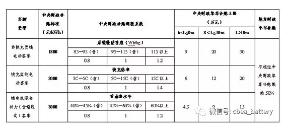 (二)在保持2016-2020年補(bǔ)貼政策總體穩(wěn)定的前提下,調(diào)整新能源汽車(chē)補(bǔ)貼標(biāo)準(zhǔn)。對(duì)新能源客車(chē),以動(dòng)力電池為補(bǔ)貼核心,以電池的生產(chǎn)成本和技術(shù)進(jìn)步水平為核算依據(jù),設(shè)定能耗水平、車(chē)輛續(xù)駛里程、電池/整車(chē)重量比重、電池性能水平等補(bǔ)貼準(zhǔn)入門(mén)檻,并綜合考慮電池容量大小、能量密度水平、充電倍率、節(jié)油率等因素確定車(chē)輛補(bǔ)貼標(biāo)準(zhǔn)。進(jìn)一步完善新能源貨車(chē)和專(zhuān)用車(chē)補(bǔ)貼標(biāo)準(zhǔn),按提供驅(qū)動(dòng)動(dòng)力的電池電量分檔累退方式核定。同時(shí),分別設(shè)置中央和地方補(bǔ)貼上限,其中地方財(cái)政補(bǔ)貼(地方各級(jí)財(cái)政補(bǔ)貼總和)不得超過(guò)中央財(cái)政單車(chē)補(bǔ)貼額的50%(詳細(xì)方案附后)。除燃料電池汽車(chē)外,各類(lèi)車(chē)型2019-2020年中央及地方補(bǔ)貼標(biāo)準(zhǔn)和上限,在現(xiàn)行標(biāo)準(zhǔn)基礎(chǔ)上退坡20%。同時(shí),有關(guān)部委將根據(jù)新能源汽車(chē)技術(shù)進(jìn)步、產(chǎn)業(yè)發(fā)展、推廣應(yīng)用規(guī)模等因素,不斷調(diào)整完善。