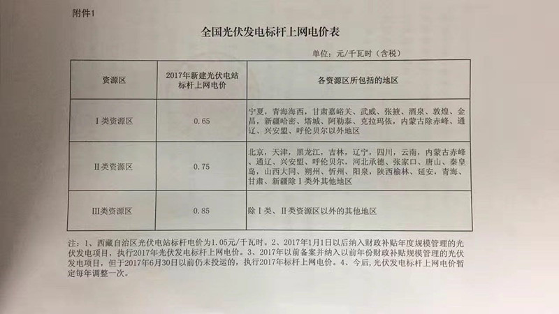 2017年1月1日之后,一類至三類資源區(qū)新建光伏電站的標桿上網(wǎng)電價分別調(diào)整為每千瓦時0.65元、0.75元、0.85元,比2016年電價每千瓦時下調(diào)0.15元、0.13元、0.13元。同時,今后光伏標桿電價根據(jù)成本變化情況每年調(diào)整一次。