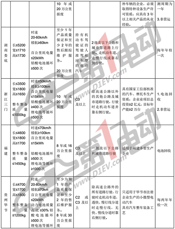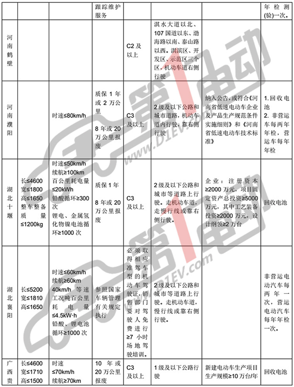 分析總結(jié)已出臺的地方管理政策,各地對低速電動車的管理越來越嚴格,全面。對企業(yè)的備案管理中,越來越多的城市提出了制造工藝、投資規(guī)模、產(chǎn)能規(guī)模、資質(zhì)等方面要求。對于產(chǎn)品方面,各地對時速、續(xù)航、尺寸大小的要求不盡相同,縱觀目前市場上主流的低速電動車產(chǎn)品,大多能滿足這些要求。有一定難度的在于百公里能耗及電池循環(huán)次數(shù)。最高如湖北襄陽要求鉛酸電池循環(huán)次數(shù)不低于1000,其他城市大多數(shù)要求循環(huán)次數(shù)不低于500次。年檢、質(zhì)保、報廢期的要求也能規(guī)范產(chǎn)品安全。在駕照方面,絕大多數(shù)城市要求的是C3牌照,山東聊城、河南商丘等少數(shù)城市要求C2牌照。路權(quán)方面,“一級及以下公路(城市)道路行駛”的規(guī)定居多,少數(shù)要求二級及以下。