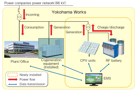 該系統(tǒng)包含有28個(gè)CPV裝置(最大總發(fā)電功率:200kW)*和一個(gè)氧化還原液流電池(容量:1MWx5小時(shí)),其中CPV裝置是產(chǎn)生可再生能源,而氧化還原液流電池則是CPV裝置所產(chǎn)生電力的存儲(chǔ)設(shè)備。通過與外部商業(yè)電網(wǎng)相連,該系統(tǒng)還能也晚間存儲(chǔ)電力公司提供的電力。該系統(tǒng)還配有一個(gè)能源管理系統(tǒng)(EMS),該系統(tǒng)能監(jiān)測(cè)CPV裝置的發(fā)電量、電池蓄電量和耗電量,并將監(jiān)測(cè)數(shù)據(jù)存儲(chǔ)至中央服務(wù)器內(nèi)。