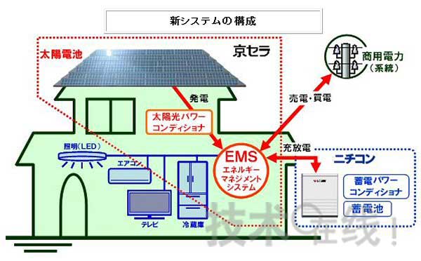 尼吉康的蓄電系統(tǒng)配備了韓國(guó)三星SDI的7.1kWh鋰離子充電電池,外形尺寸為120cm×90cm×35cm,重200kg。如果需要,蓄電系統(tǒng)最大可增設(shè)至14.2kWh。該系統(tǒng)和太陽(yáng)能電池系統(tǒng)一起,結(jié)合京瓷自主開(kāi)發(fā)的能源管理系統(tǒng)(EMS)構(gòu)成了新太陽(yáng)能供電系統(tǒng)。