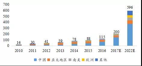 各區(qū)域電動汽車和儲能鋰離子電池產(chǎn)能情況(單位:GWh)