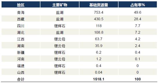我國各省鋰資源儲量分布: