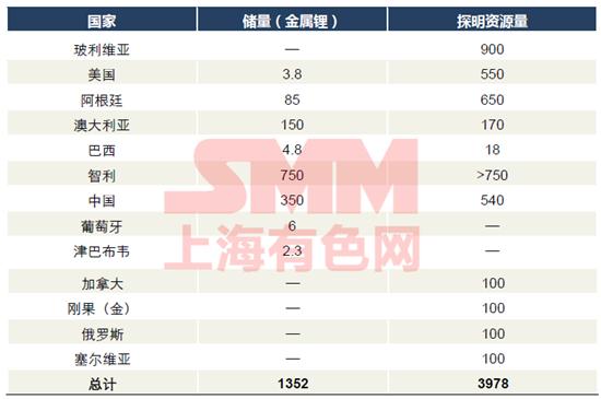 根據(jù)美國地質(zhì)調(diào)查局公布的數(shù)據(jù),世界鋰資源儲量(金屬鋰)總計(jì)為1,352萬噸,探明資源量為3,978萬噸。其中世界探明資源量排名前十一位為玻利維亞、智利、阿根廷、美國、中國、澳大利亞、加拿大、剛果(金)、俄羅斯、塞爾維亞和巴西。