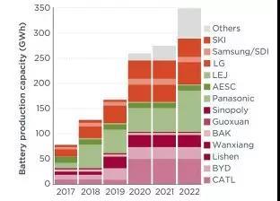 從全球來看,原有參與者與轉(zhuǎn)型企業(yè)近幾年都在擴張產(chǎn)能,根據(jù)IEA的統(tǒng)計,2017年全球鋰電池產(chǎn)能已經(jīng)達到200GWh,2022年有望達到600GWh。在新能源汽車產(chǎn)業(yè)拉動下,主流企業(yè)產(chǎn)能還在進一步擴大。統(tǒng)計發(fā)現(xiàn),現(xiàn)在主流企業(yè)的產(chǎn)能基本在5GWh以上,在2020年左右產(chǎn)能將達到20GWh左右。