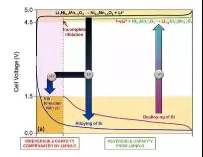 在理想狀態(tài)下若純Si在完全嵌鋰下,比容量可以達(dá)到4200mAh/g,但是也伴隨著高達(dá)300%的體積膨脹,另外一種硅的氧化物—SiOX作為負(fù)極材料,Si-O鍵的鍵能是Si-Si鍵能的兩倍,由于SiOx首次嵌鋰的過程中會生成金屬鋰氧化物L(fēng)iXO,這導(dǎo)致氧化亞硅材料的首次庫倫效率僅為70%左右,近年來經(jīng)過諸多的技術(shù)改進(jìn),首次效率也僅僅提高到80%左右,這與石墨材料的94%還有很大的差距,為了縮短差距各研究所、高校、公司等都提出自己的材料改性辦法得以讓SiOX材料發(fā)揮出高比容量的優(yōu)勢。硅碳負(fù)極補(bǔ)鋰工藝是在硅碳負(fù)極表面預(yù)涂一層鋰金屬,該涂層與負(fù)極緊密接觸,在灌注電解液后與負(fù)極發(fā)生反應(yīng)嵌入負(fù)極顆粒內(nèi)部,預(yù)存一部分鋰離子在負(fù)極內(nèi)部,從而彌補(bǔ)首次充放電或者循環(huán)過程中由于形成或修復(fù)SEI膜所需要消耗的Li離子。