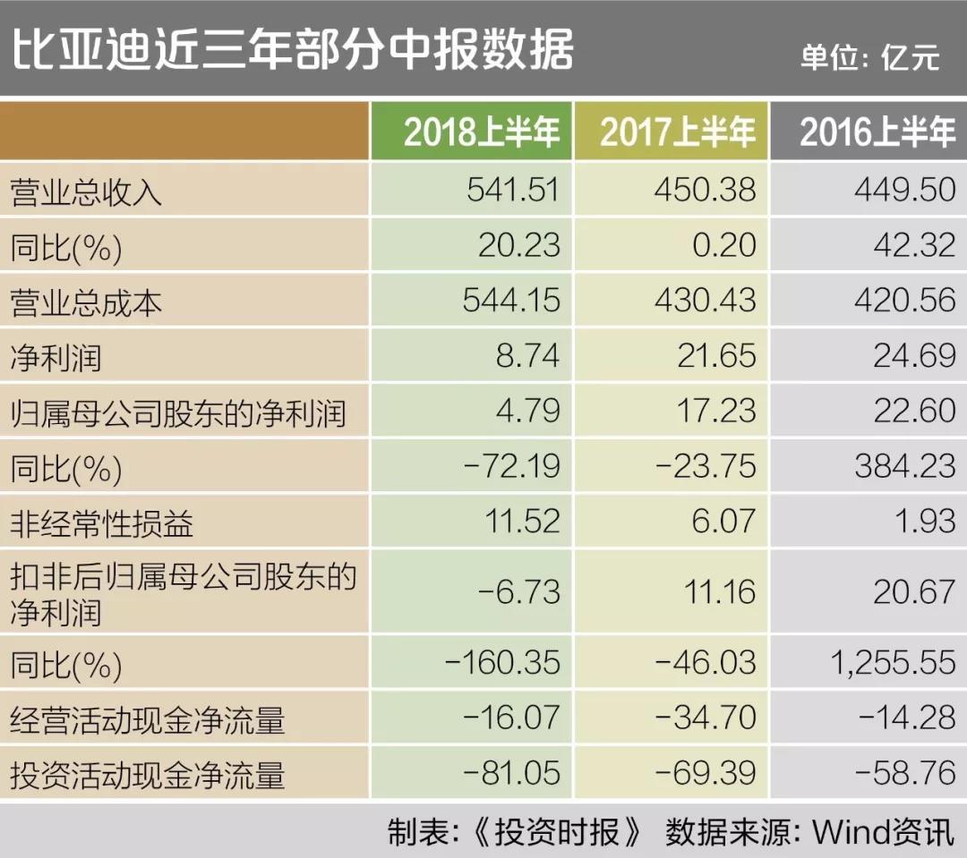 2018年8月30日,新能源車的龍頭企業(yè)比亞迪(002594.SZ)披露了最新一期的年中報(bào)告,報(bào)告顯示,上半年比亞迪實(shí)現(xiàn)營收521.63億元,同比增加20.23%,獲得政府補(bǔ)助為8.94億元,而去年同期該項(xiàng)數(shù)值為6.12億元。注意,該公司扣非后歸母凈利潤同比下滑160.35%,即半年虧損6.73億元,也就是說繼一季度后,比亞迪的虧損規(guī)模正在繼續(xù)增大。