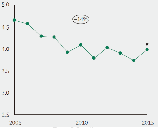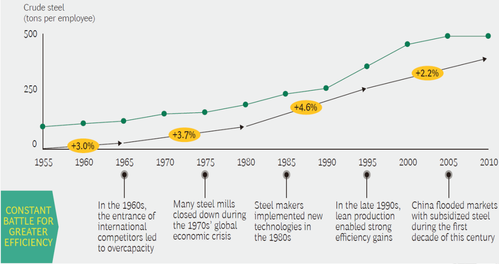 有人可能會說,一般制造業(yè)不能作為電力行業(yè)的典型參考案例,因為它的資本密集程度要低得多。但兩大資本密集型行業(yè)(化工和鋼鐵)的經(jīng)驗也證實了一種觀點,即發(fā)電企業(yè)可以通過一系列的能效提升手段,使生產(chǎn)率顯著增長。在過去的 15 年中,歐洲化學(xué)工業(yè)的勞動生產(chǎn)率以每年超過 2%的速度增長。到 2000 年,化工行業(yè)通過專注于核心業(yè)務(wù),剝離外圍業(yè)務(wù),實現(xiàn)了高度整合。在接下來的 10 年,面對中國的競爭和全球經(jīng)濟(jì)低迷,化工企業(yè)認(rèn)識到,必須更深刻的思考如何提高經(jīng)營效率。全廠優(yōu)化、專業(yè)化和過程自動化都是驅(qū)動行業(yè)生產(chǎn)率增長的有效手段。在德國,鋼鐵行業(yè)在過去半個世紀(jì)里提高了大約三倍的生產(chǎn)率,經(jīng)受住了幾次危機(jī)的考驗。鋼鐵制造商通過采用新技術(shù)和精益生產(chǎn)系統(tǒng)來促進(jìn)持續(xù)改進(jìn),從而適應(yīng)成本的快速削減。
