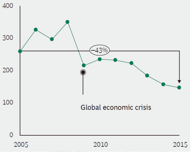 受行業(yè)重大變革影響,歐洲的傳統(tǒng)發(fā)電企業(yè)一直如履薄冰。在過去 10 年間,受產(chǎn)能過剩導(dǎo)致的利用小時數(shù)和上網(wǎng)電價大幅下降影響,發(fā)電企業(yè)承受著巨大的市場競爭壓力。自 2005 年以來,歐洲十大發(fā)電企業(yè),自 2005 年以來,歐洲十大發(fā)電企業(yè)由化石燃料、核電或水力發(fā)電所構(gòu)成的裝機(jī)中,設(shè)備利用水平下降了 14%,每兆瓦裝機(jī)容量的年營收實際降幅已經(jīng)超過了 40%,同時,發(fā)電企業(yè)的股價表現(xiàn)不佳,信用評級也在下跌。許多其他地區(qū)的生產(chǎn)商也正面臨相似的挑戰(zhàn)。