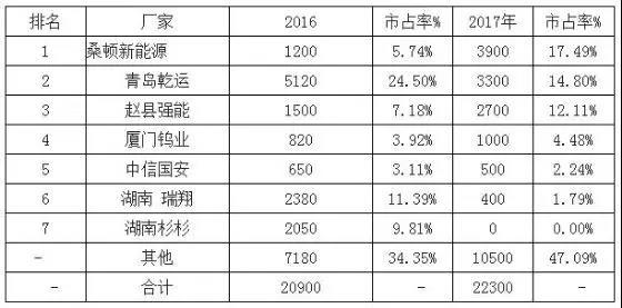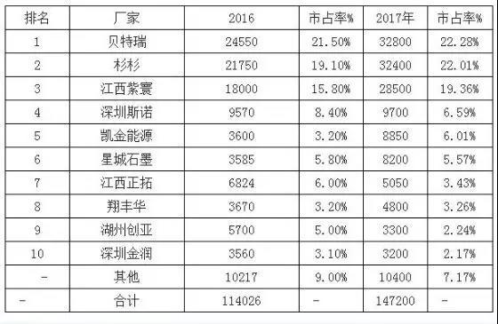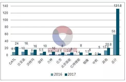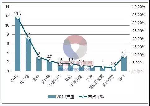 2017年國(guó)內(nèi)主要?jiǎng)恿﹄姵貜S家產(chǎn)量及市占率(GWh)