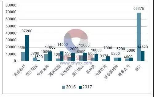 2016-2017年國(guó)內(nèi)主要LFP廠家產(chǎn)能統(tǒng)計(jì)(噸)