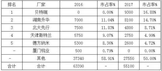 2016-2017年國(guó)內(nèi)主要NCM廠家產(chǎn)量及市占率(噸,%)