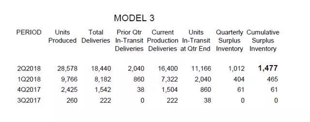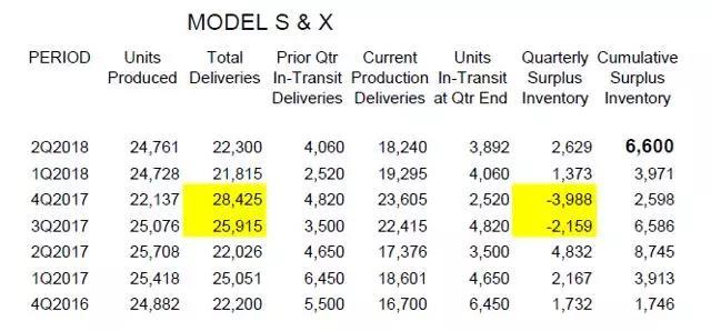 這個(gè)表格的原理是這樣的:特斯拉在每個(gè)季度結(jié)束后的幾天內(nèi)會(huì)報(bào)告三個(gè)關(guān)鍵數(shù)字:生產(chǎn)、交付以及在途中、預(yù)計(jì)下一季度交付的汽車數(shù)量。對(duì)ModelS和ModelX而言,今年第二季度這三個(gè)數(shù)字分別是24761、 22300和 3892臺(tái),但我們需要從第二季度交付的數(shù)量中減去在第一季度已生產(chǎn)好的數(shù)量,來(lái)得出第二季度實(shí)際生產(chǎn)并交付的數(shù)量。