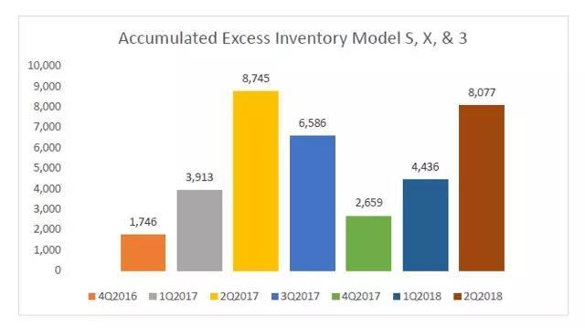 從2016年第3季度末到2017年第2季度末,僅僅三個(gè)季度,特斯拉的庫(kù)存從14臺(tái)增至8822臺(tái),未售出庫(kù)存的價(jià)值超過(guò)10億美元。
