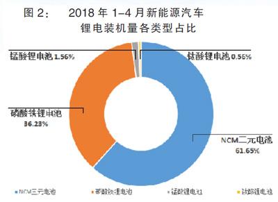 數(shù)據(jù)顯示,2018年1-4月新能源汽車鋰電裝機(jī)量8.23GWh,同比增長212.91%。從各類型鋰電看,NCM三元電池裝機(jī)以5.07 GWh占比61.65%,排在第一位。磷酸鐵鋰電池以2.98GWh占比36.23%,排在第二位,市場份額已經(jīng)萎縮至不到四成;錳酸鋰電池以128.76 MWh占比1.56%,排在第三位;鈦酸鋰電池以45.80 MWh占比0.56%,排在最后(見圖2)。