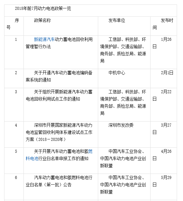 經(jīng)電動汽車資源網(wǎng)統(tǒng)計(jì),2018年前7月,國家及地方共發(fā)布動力電池方面的政策或標(biāo)準(zhǔn)10條,其中7條直接與動力電池回收利用有關(guān),2條和動力電池白名單有關(guān),1條和新建動力電池企業(yè)投資項(xiàng)目有關(guān)。