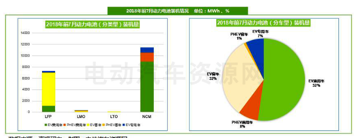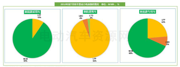 按動力電池類型分,2018年前7月裝機(jī)的動力電池類型有:三元鋰、磷酸鐵鋰、錳酸鋰、鈦酸鋰等。其中,裝機(jī)最多的為三元鋰電池,前7月裝機(jī)量為11.44GWh,占總裝機(jī)量的59.35%;其次為磷酸鐵鋰電池,前7月裝機(jī)量為7.34GWh,占總裝機(jī)量的38.07%;錳酸鋰和鈦酸鋰的裝機(jī)量均在0.5GWh以下,占比分別為1.93%、0.65%。