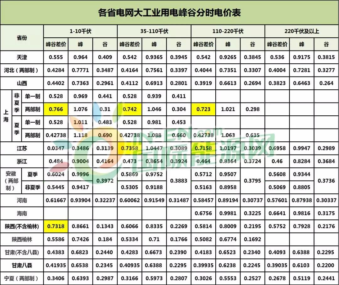 “1-10千伏”的峰谷差價(jià)超過0.7元的省份有上海(非夏季、兩部制),為0.766元,陜西(不含榆林)為0.7318元。