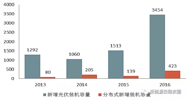 基于近幾年化學儲能技術的飛速發(fā)展,化學儲能成本不斷降低,儲能經濟性為化學儲能的進一步商業(yè)化應用與推廣提供了前提條件。另外,在大力支持和發(fā)展可再生能源的政策背景下,近幾年我國的新增光伏裝機容量大體上呈現(xiàn)出一個上漲的趨勢。根據(jù)相關數(shù)據(jù)統(tǒng)計顯示,截至2015年底,我國的光伏發(fā)電累計裝機容量就已達到4318萬千瓦,成為全球光伏發(fā)電裝機容量最大的國家;截至2016年底,我國的新增和累計光伏裝機容量均達到了全球第一。分布式項目在近年也持續(xù)增長,2016年分布式光伏發(fā)電新增裝機容量相比于2015年增長了200%。分布式裝機容量的快速增長同時帶動了儲能裝機容量的快速增長。