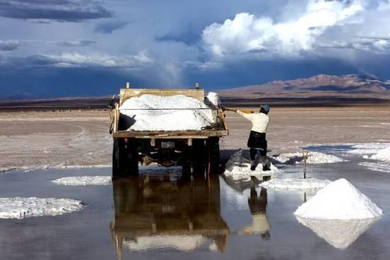 圖:這名男人在玻利維亞烏尤尼的鹽灘工作,這個(gè)面積4000平方英里的偏遠(yuǎn)地區(qū)擁有世界上最大的鋰儲(chǔ)量