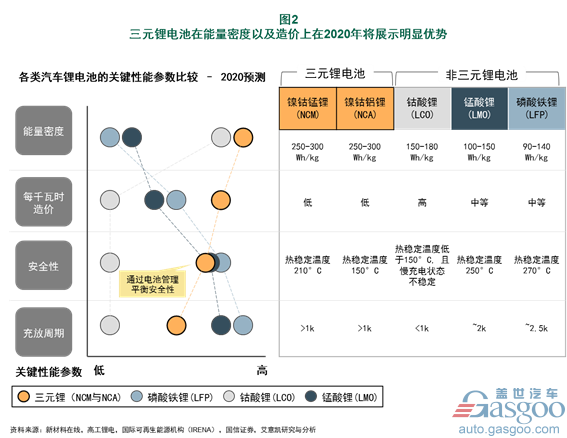 能量密度:在中國(guó),一系列政策文件中指出已經(jīng)對(duì)乘用車單體電池的能量密度提出了明確的要求:到2020 年要達(dá)到300Wh/kg;2030年則要求提升至500Wh/Kg。在目前已經(jīng)商業(yè)化的動(dòng)力電池技術(shù)中,三元鋰電池將會(huì)是唯一可能夠達(dá)到2020年國(guó)家標(biāo)準(zhǔn)的電池種類,其能量密度優(yōu)勢(shì)已被廣泛認(rèn)可。