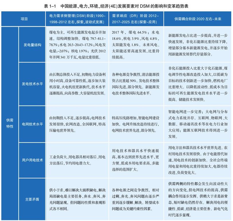 表1-1 是能源、電力、環(huán)境、經(jīng)濟(jì)(4E)發(fā)展要素與DSM的影響和變革趨勢表。從表中不難看出,DSM、DR以及供需耦合,都是以解決電力供需問題為導(dǎo)向的,因此,任何管理手段都必須隨著問題的發(fā)展和解決問題的需求與時俱進(jìn)。DSM每個階段的時間長短并不相同,變革并不因為時間長短而變,而供需特性和低碳(結(jié)構(gòu))特性變化才是關(guān)鍵點(diǎn),即電力短缺與富余度以及新能源所占的發(fā)電比重大小決定了不同階段到來的時間點(diǎn)。從電力需求管理手段的內(nèi)涵上看,三個階段在時間的連接處和對應(yīng)的措施上是會有重疊的,且后一階段的措施是對前一階段的繼承、完善、發(fā)展而不是割裂。面向未來,一般意義上的電力需求管理將會一直延續(xù)至電力的長遠(yuǎn)發(fā)展,但作為傳統(tǒng)或特定意義上的“DSM”的作用將隨著電力供需矛盾轉(zhuǎn)化、能源電力清潔低碳轉(zhuǎn)型發(fā)展、電力技術(shù)和用電技術(shù)的進(jìn)步等而逐步淡化,并終將成為歷史。