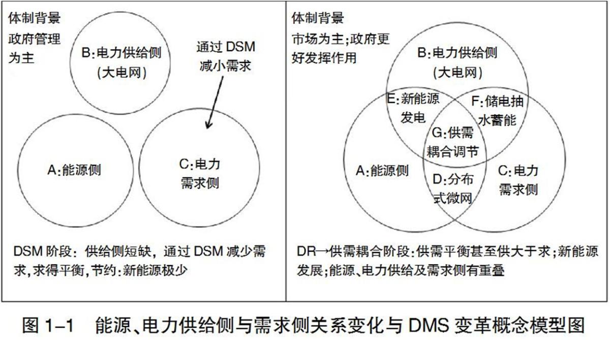 圖1-1是說明能源側(cè)、電力供給側(cè)、電力需求側(cè)的關(guān)系變化與DMS變革的概念模型圖。圖中“A:能源側(cè)”“B:電力供給側(cè)”“C:電力需求側(cè)”等3個圓形圖案。雖然電力的供與需在物理上共同組成一個系統(tǒng),且電能的發(fā)、輸、配、供、用在電網(wǎng)內(nèi)是瞬間平衡的,但各環(huán)節(jié)的概念是清晰的。圓圈圖之外可以看成是體制機(jī)制部分,圖的左側(cè)示意DSM階段主要是發(fā)揮政府行政管理的作用,而圖的右側(cè)示意DSM向DR及供需耦合階段的變革主要是發(fā)揮市場機(jī)制的作用,但政府也應(yīng)更好發(fā)揮作用。在圖的左側(cè)部分可以看出,DSM第一階段是在供給短缺、政府管理背景下,A、B、C三個不相交的圓(或者相交極少)所代表的方面,各方按上下游關(guān)系和各自規(guī)律運(yùn)轉(zhuǎn)。在這一階段,DSM主要通過減少電力需求側(cè)的需求(節(jié)約),解決供給側(cè)的缺口或者滿足調(diào)峰需求,達(dá)到電網(wǎng)及電力系統(tǒng)安全前提下,技術(shù)層面上的供需平衡。顯然,此階段的DSM顯然不是為了解決能源電力低碳轉(zhuǎn)型問題。在圖的右半部分可以看出,在供需平衡或富余、市場手段為主政府發(fā)揮更好作用背景下, A、B、C三個圓相交了,相交后形成了4個新區(qū),即D:分布式微網(wǎng)區(qū);E:新能源發(fā)電區(qū);F:儲電包括抽水蓄能區(qū);G:供需耦合區(qū)。當(dāng)然,A、B、C三個圓并不是同時相交的,相交的面積重合度也不同。三圓相交時間和重合度大小,決定了SM向DR方向變革的快慢和程度,這也是各國的DR并不是同一個模式的原因。在圖上雖然沒有顯示出來,但A、C兩個大圓所包括的所有內(nèi)容都是智能電網(wǎng)覆蓋區(qū),圓與圓相重合的部分是智能電網(wǎng)能夠發(fā)揮最大作用的部分;G部分是電力供需耦合發(fā)揮作用的部分。而A、B、C三個大圓則是能源互聯(lián)網(wǎng)覆蓋區(qū),也說明了,能源互聯(lián)網(wǎng)的基礎(chǔ)和核心是智能電網(wǎng)。我們由前述的未來發(fā)展的趨勢可知,3大圓相交的部分會越來越大,所以DR發(fā)揮作用的范圍也越來越大,當(dāng)3圓相交到很大程度時,電力供需耦合將發(fā)揮主導(dǎo)作用。