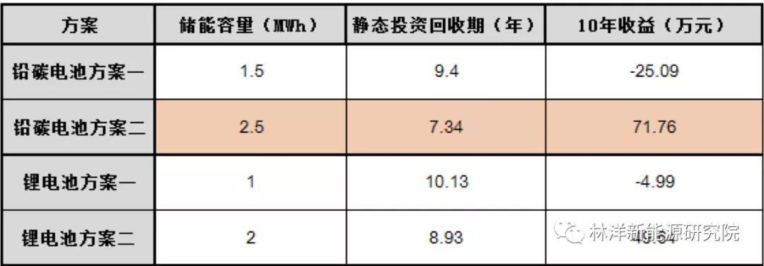 在四個方案里,鉛碳電池方案二投資收益最好,10年投資收益可以達(dá)到71.76萬元。