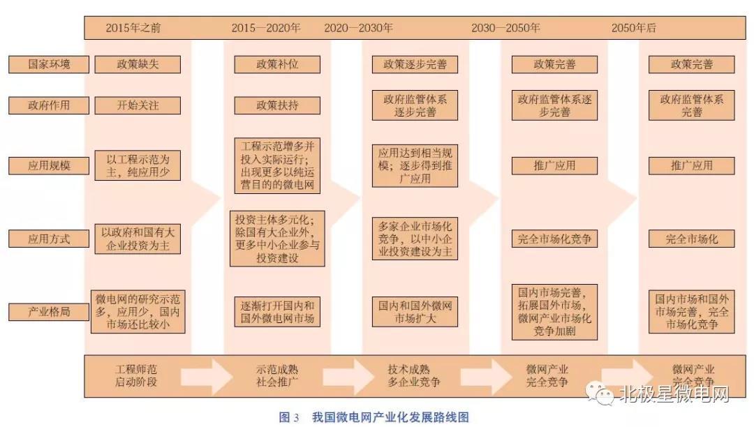 從樂觀角度看,未來 20 年將是微網(wǎng)產(chǎn)業(yè)政策完善階段,也是市場化蓬勃發(fā)展的階段。微網(wǎng)發(fā)展大幅向企業(yè)及獨立經(jīng)營型轉(zhuǎn)變的階段,且不需要政府補貼,市場相對開放,競價策略將會大幅推廣。對微網(wǎng)產(chǎn)業(yè)化發(fā)展路線詳細(xì)預(yù)測如圖 3 和圖 4 所示。