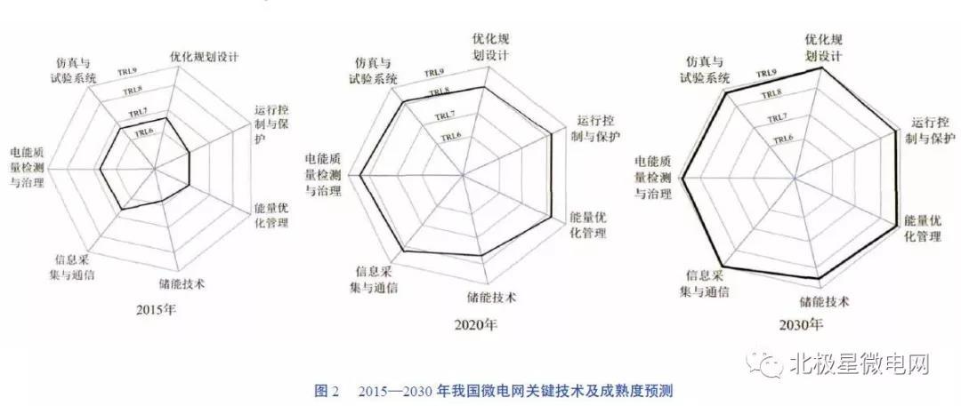 從技術(shù)上看,至 2020 年微網(wǎng)關(guān)鍵技術(shù)能夠基本支撐分布式可再生能源大規(guī)模推廣,至2030 年微網(wǎng)技術(shù)能夠基本成熟,走向商業(yè)化,具體各技術(shù)方面發(fā)展預(yù)測如圖 2 所示。