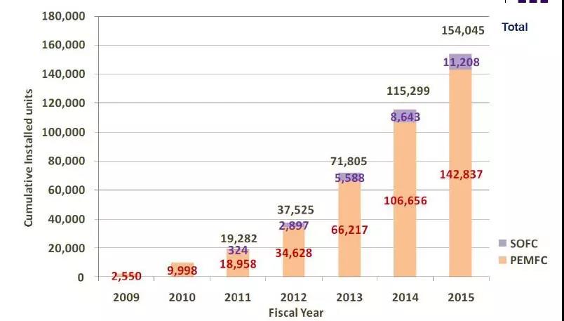 分布式燃料電池系統(tǒng)目前分為重整制氫式燃料電池系統(tǒng)(多以天然氣為原料)以及純氫燃料電池系統(tǒng)。近年來,前者在歐洲、美國及日本發(fā)展迅猛,尤以日本的普及率最高。截至 2016 年底日本已經(jīng)累計(jì)推廣 20 萬臺(tái) ,2016 年底的售價(jià)為 127 萬日元(約為 7.5 萬元人民幣),補(bǔ)貼降低到 15 萬日元(約為 8800 元)。政府的目標(biāo)是到 2030 年累計(jì)推廣 530 萬臺(tái)。