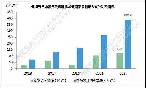 據(jù)中關(guān)村儲能產(chǎn)業(yè)技術(shù)聯(lián)盟(CNESA)項目庫的不完全統(tǒng)計,截至2017年底,中國已投運儲能項目累計裝機規(guī)模為28.9GW。其中,抽水蓄能的累計裝機占比最大,接近99%,電化學(xué)儲能項目的累計裝機規(guī)模緊隨其后,為389.8MW,占比為1.3%,較上一年增長0.2個百分點。2017年,中國新增投運電化學(xué)儲能項目的功率規(guī)模為121MW,同比增速超過15%。