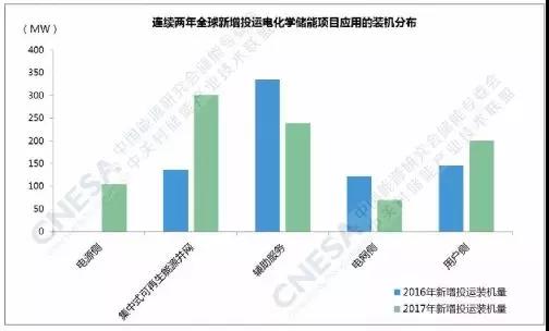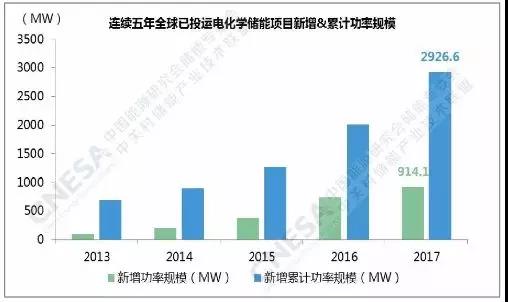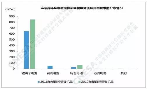 據(jù)中關(guān)村儲能產(chǎn)業(yè)技術(shù)聯(lián)盟(CNESA)項目庫的不完全統(tǒng)計,截至2017年底,全球已投運儲能項目累計裝機規(guī)模為175.4GW。其中,抽水蓄能的累計裝機占比最大,為96%,較上一年下降1個百分點。電化學(xué)儲能項目的累計功率規(guī)模為2926.6MW,占比1.7%,較上一年增長0.5個百分點。2017年,全球新增投運電化學(xué)儲能項目的功率規(guī)模為914.1MW,同比增速超過20%。