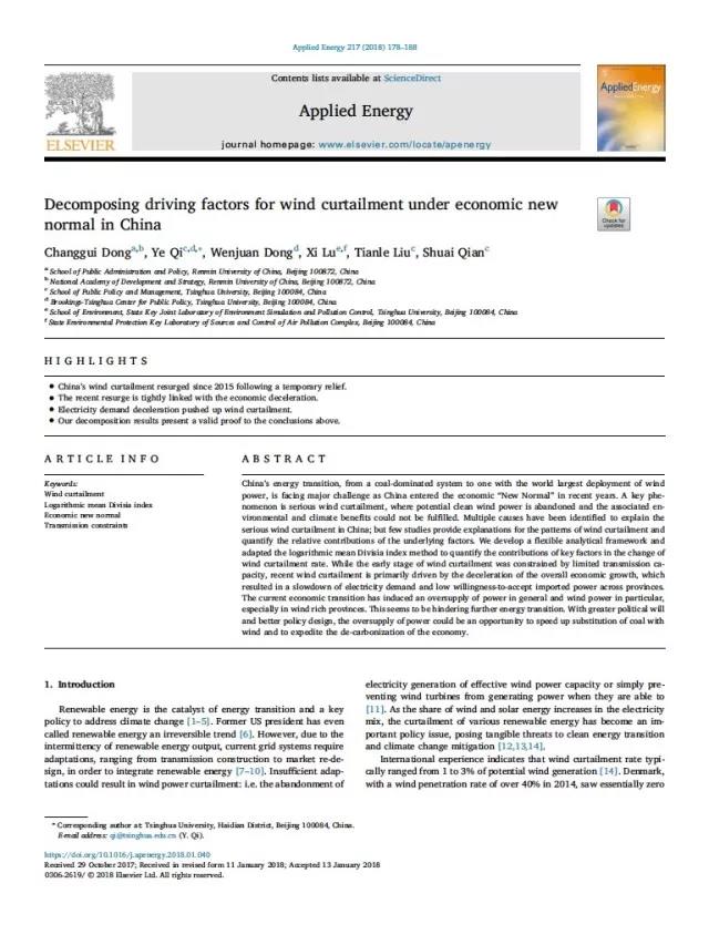 英文標(biāo)題:Decomposing driving factors for wind curtailment under economic new normal in China