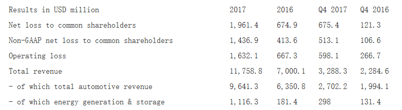 中國儲能網(wǎng)訊:特斯拉公司(Tesla Inc.)(納斯達(dá)克股票代碼:TSLA)2017年凈虧損額從2016年的6.749億美元擴(kuò)大至19.6億美元(合16億歐元),盡管同期營收大幅增長了68%。這家電動汽車和光伏產(chǎn)品制造商周三公布,根據(jù)非美國通用會計準(zhǔn)則對普通股股東的凈損失近14.4億美元。該公司表示:“到2018年的某個時候,我們預(yù)計將持續(xù)創(chuàng)造季度正盈利?!?