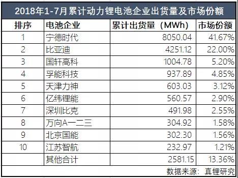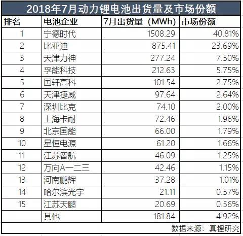 7月共有48家電池企業(yè)實現(xiàn)裝機,比6月又減少了10家。月度出貨量排行榜中,寧德時代和比亞迪依然分列一二排名,當月市場份額分別達40.81%和23.69%,二者合計執(zhí)掌國內(nèi)六成多的動力電池市場。天津力神位列第三,市場份額7.5%。