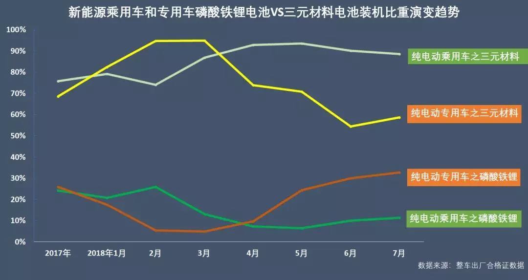 中國儲能網(wǎng)訊:過去兩三年,動力電池領(lǐng)域,“三元崛起,鐵鋰式微”一直是主旋律。但是,7月份,在純電動乘用車和專用車領(lǐng)域,磷酸鐵鋰電池的裝機比重呈向上之勢。部分企業(yè)看到了磷酸鐵鋰的成本優(yōu)勢,不再尋求最高補貼額度。這是一個可喜的變化。