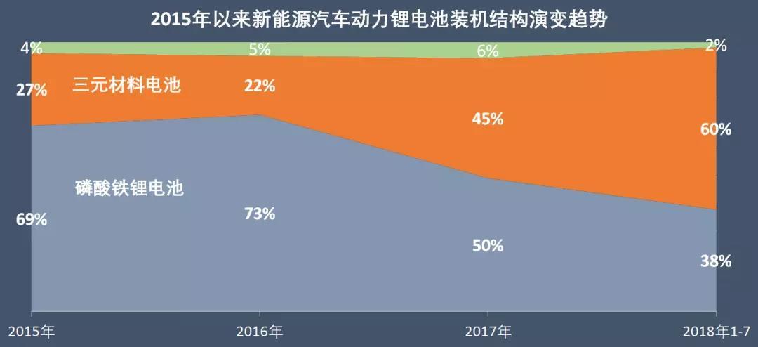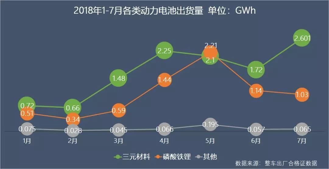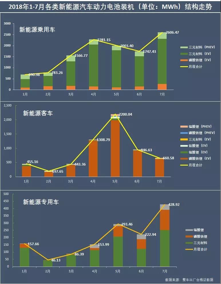 分析2015年以來新能源汽車各類動力電池裝機結(jié)構(gòu)的演變,可以發(fā)現(xiàn)三元材料走強已是明顯的趨勢。不過,這一格局的演變系乘用車市場的走強和客車市場的疲軟雙向作用造成——三元材料電池的裝機大戶是新能源乘用車,而新能源客車是磷酸鐵鋰電池的裝機大戶,2018年以來尤其是6、7月份,新能源客車市場持續(xù)低迷,其在磷酸鐵鋰電池市場的高權(quán)重造成了該類型裝機量的連續(xù)下行,變相也推高了三元材料電池的出貨比重。