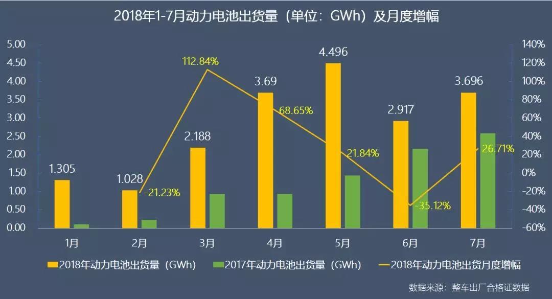 受整車產(chǎn)量回升影響,7月份國內(nèi)動力電池出貨調(diào)轉(zhuǎn)跌勢,以26.71%的月增幅達到3.696GWh,同比增幅也上升至42.8%,出貨量與4月份相當,但較補貼新政實施前的5月還有不小差距。7月動力電池出貨的增量主要來自新能源乘用車。