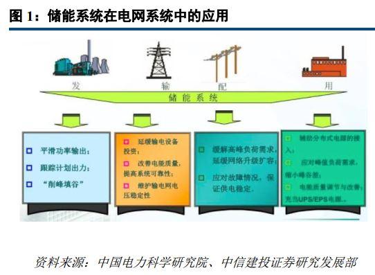 儲能在電力系統(tǒng)中應用廣泛。 儲能泛指能量的存儲,本報告中儲能特指電能的儲存。 在整個電力系統(tǒng)各個環(huán)節(jié),儲能都可以有其應用, 包括:在發(fā)電側(cè),可以提高發(fā)電的穩(wěn)定性,提高電能質(zhì)量,從而促使可再生能源大規(guī)模并網(wǎng);在輸變電環(huán)節(jié),可以聯(lián)合電源降低輸變電的成本;在配送電環(huán)節(jié),可以緩解配電的初始投資以及電網(wǎng)的升級擴容;在用戶側(cè),可以通過峰谷差套利,提高用戶的電能質(zhì)量,減少用戶的用電成本。