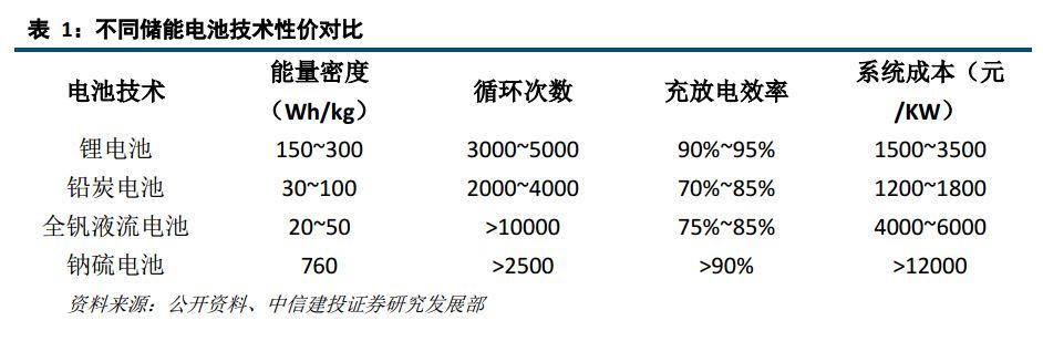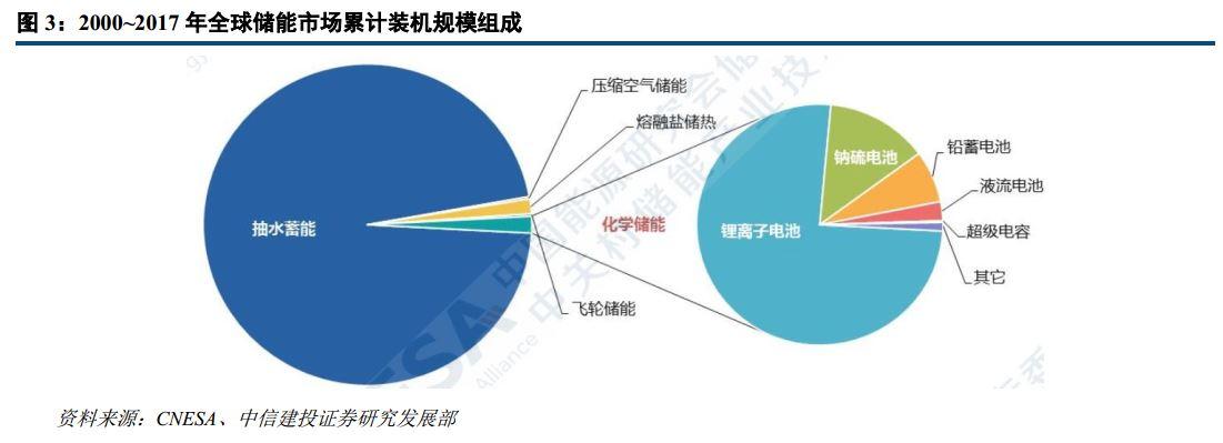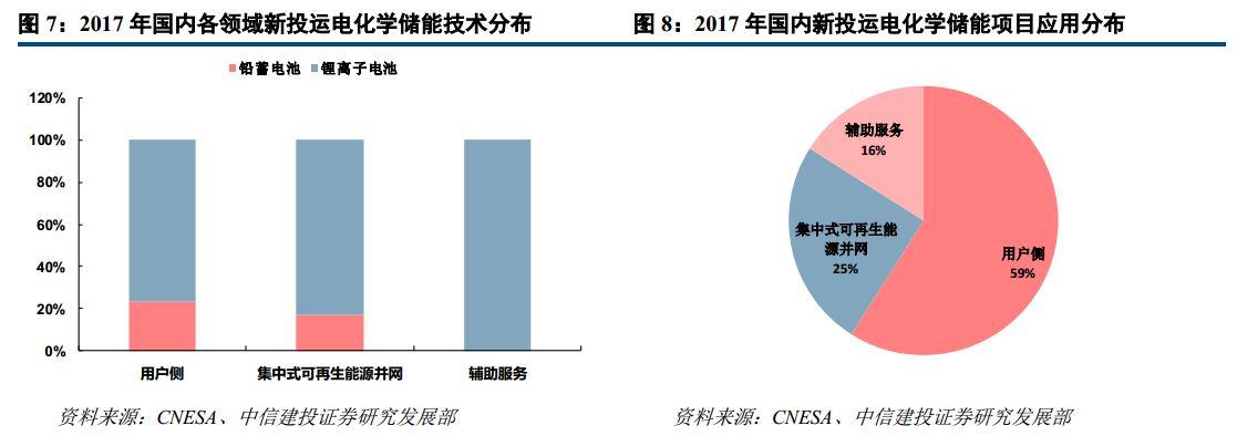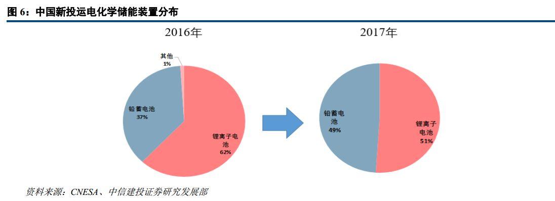 鋰電池和鉛蓄電池占據(jù)大部分電化學儲能市場。 電化學儲能載體是各種二次電池,主要包括鋰離子電池、鉛蓄電池、鈉硫電池和液流電池等。 從各種儲能電池性能比較來看,鋰電池與鉛蓄電池由于產(chǎn)業(yè)化基礎(chǔ)較好,相比其他路線具有明顯成本優(yōu)勢,因此是目前電化學儲能的主要參與者。 從全球電化學儲能技術(shù)分布上來看,鋰離子電池功率規(guī)模最大, 2017 年新增投運功率規(guī)模 846MW,在電化學儲能中占比超過 90%;而國內(nèi)份額則主要被鋰離子電池和鉛蓄電池占據(jù), 2016、 2017 年新增電化學儲能幾乎全部采用鋰離子電池和鉛蓄電池,其中2017 年兩者占比分別達到 51%、 49%。