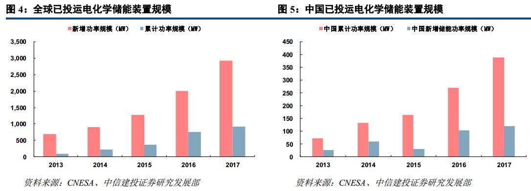 電化學儲能現(xiàn)總體規(guī)模占比較小,但近幾年發(fā)展迅猛。 根據(jù) CNESA 項目庫的不完全統(tǒng)計,截止 2017 年底全球已投運儲能項目累計裝機規(guī)模為 175.4GW,抽水儲能占比達到 96%,其次為電化學儲能,占比為 1.7%。雖然目前電化學儲能占比較小,但卻是發(fā)展速度最快的儲能技術(shù), 2012~2016 年全球電化學儲能累計裝機量復合增長率達到 32%。截止 2017 年底全球已投運電化學儲能項目累計功率規(guī)模為 2926.6MW, 新增規(guī)劃、在建的電化學儲能項目裝機規(guī)模為 3063.7MW;國內(nèi)已投運電化學儲能累計規(guī)模為 389.8MW,新增規(guī)劃、在建裝機規(guī)模為 705.3MW,預計新建項目的陸續(xù)投產(chǎn)將支撐電化學儲能維持較高增速。
