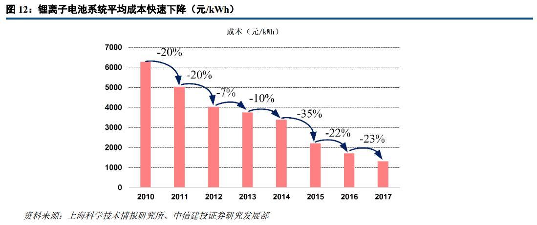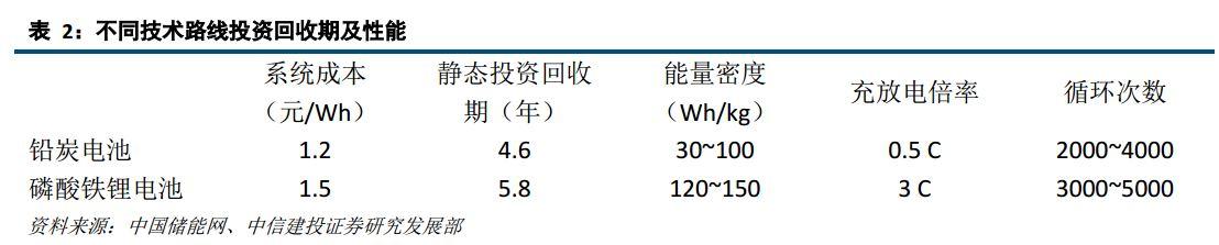 鋰離子電池快速發(fā)展所帶來的成本優(yōu)勢將助其逐漸擴大市場。 從表 2 可以看出,利用鉛炭電池套利靜態(tài)投資回收期不足 5 年,已經(jīng)具有商業(yè)化可行性。由于鋰電池成本相對較高,現(xiàn)階段鋰電池的投資回收期要長于鉛蓄電池。根據(jù) CNESA 的統(tǒng)計, 2017 年用戶側(cè)領(lǐng)域新增電化學儲能項目中, 鉛蓄電池所占比重最大,為 77%,剩余為鋰電池,也說明出于成本考慮,現(xiàn)在企業(yè)更傾向于安裝經(jīng)濟效益更佳的鉛蓄電池。但隨著鋰離子電池技術(shù)迅速發(fā)展,其成本自 2010 年以來已經(jīng)下降近 80%。根據(jù)國家發(fā)布的《節(jié)能與新能源汽車技術(shù)路線圖》, 到 2020年鋰電系統(tǒng)成本將降至 1 元/Wh 以下,屆時投資回收期有望縮短至 3.9 年。 且隨著退役動力電池進入梯次利用領(lǐng)域,儲能成本將會進一步下降。