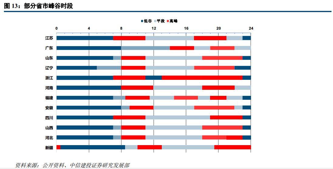 峰谷電價的大力推行為儲能套利提供可觀空間。 我國目前絕大部分省市工業(yè)大戶均已實施峰谷電價制, 通過降低夜間低谷期電價,提高白天高峰期電價,來鼓勵用戶分時計劃用電, 從而有利于電力公司均衡供應電力,降低生產(chǎn)成本,并避免部分發(fā)電機組頻繁啟停造成的巨大損耗等問題,保證電力系統(tǒng)的安全與穩(wěn)定。儲能用于峰谷電價套利, 用戶可以在電價較低的谷期利用儲能裝置存儲電能, 在電高峰期使用存儲好的電能,避免直接大規(guī)模使用高價的電網(wǎng)電能,如此可以降低用戶的電力使用成本,實現(xiàn)峰谷電價套利。根據(jù)國家電網(wǎng)數(shù)據(jù),全國用電大省峰谷價差分布于 0.4~0.9 元/kWh,特別的,對于江蘇和廣東兩個用電量全國前二的省份,其峰谷價差高于 0.8 元/kWh,為用戶側(cè)利用儲能來套利峰谷價差提供了可觀空間。
