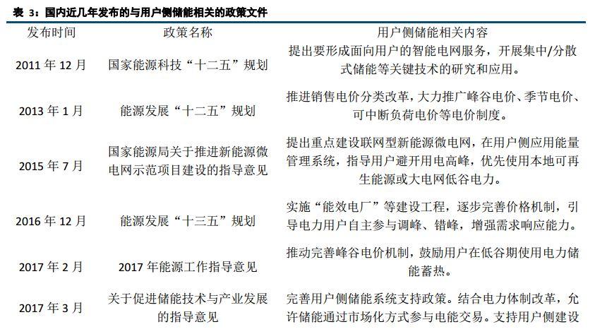 國內(nèi)利好政策頻出,用戶側(cè)儲能受到大力支持。 自 2011 年《國家能源科技“十二五”規(guī)劃》出臺,其中明確提出要建成面向用戶的智能電網(wǎng)服務,并開展集中/分散式儲能等關(guān)鍵技術(shù)的研究和應用,此后不斷有政策出臺,對于推動用戶側(cè)儲能發(fā)展具有重要的意義。整體上,用戶側(cè)儲能屬于儲能的一個細分領(lǐng)域,尚未有專門的單獨對該行業(yè)進行指導的政策性文件; 但是在一些重要的發(fā)展規(guī)劃或指導意見中都對其表達了的支持。相關(guān)政策主要分為兩類,一是在電改工程里,堅定推廣完善峰谷電價、季節(jié)電價等價格機制;二是放開用戶側(cè)市場,鼓勵用戶自主參與儲能調(diào)峰。