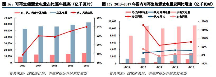 風、光發(fā)電總量及占比不斷提高。 截止 2017 年底我國可再生能源發(fā)電裝機總量達到 6.5 億千瓦,其中,水電裝機 3.41 億千瓦,風電裝機 1.64 億千瓦,光伏發(fā)電裝機 1.3 億千瓦,可再生能源發(fā)電裝機約占全部電力裝機的36.6%。同時,可再生能源發(fā)電量在總發(fā)電量占比逐年提高, 2017 年可再生能源發(fā)電量達 1.7 萬億千瓦時,占全部發(fā)電量的 26.4%。從可再生能源發(fā)電結(jié)構(gòu)上看,水電已經(jīng)進入低速增長期,風、光電仍維持高增速。